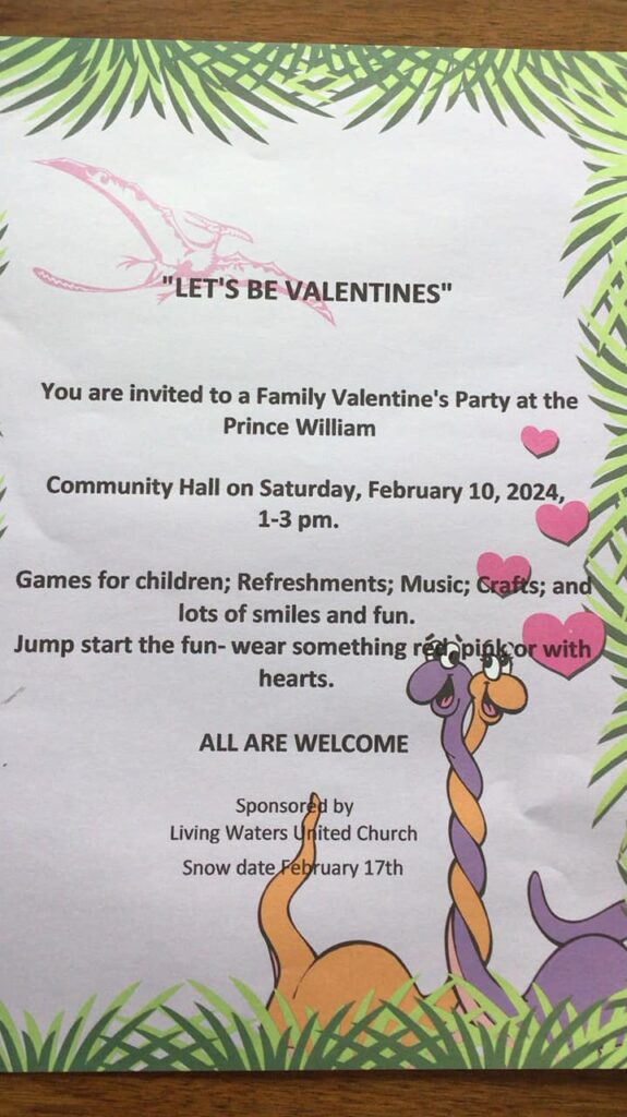 You are invited to a Family Valentine’s Party at the Prince William Community Hall on Saturday, Feb. 10, 2024 from 1pm to 3pm.