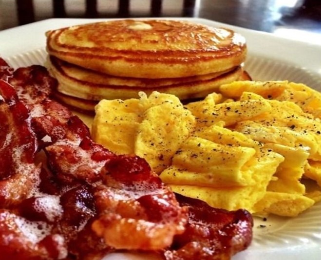Bacon & Sausage, Scrambled Eggs & Pancakes, Baked Beans & Home Fries, Homemade Brown Bread, Fruit Salad. Tea-Coffee-Juice